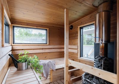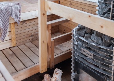 Syvingin saunasta avautuu upeat järvimaisemat jokaisella seinällä sijaitsevan avaran ikkunan ansioista. Saunaan sopii väljästi 5 henkilöä kerrallaan. Iso 150 kg kiuaskiviä omaavasta puukiuas tarjoilee upeat löylyt.