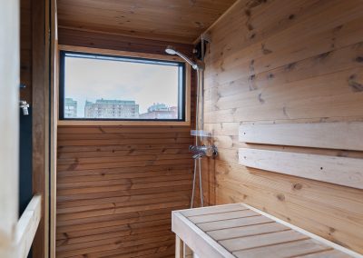 Saunatilassa on suihku josta tulee kylmä- ja lämmin vesi peseytymistä varten.
