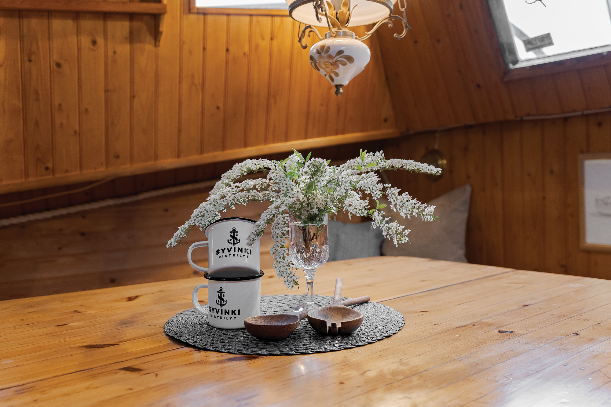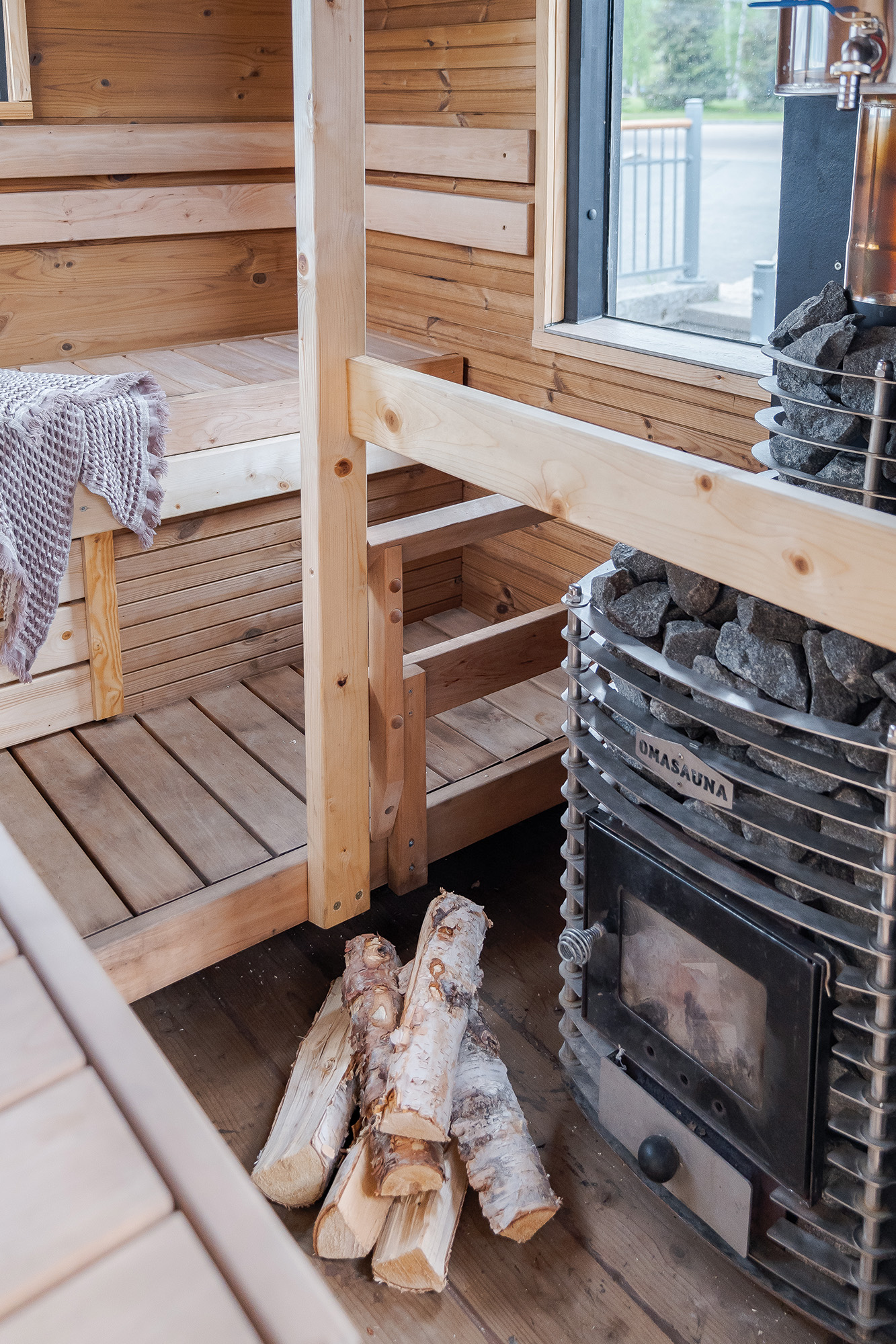 Syvingin saunasta avautuu upeat järvimaisemat jokaisella seinällä sijaitsevan avaran ikkunan ansioista. Saunaan sopii väljästi 5 henkilöä kerrallaan. Iso 150 kg kiuaskiviä omaavasta puukiuas tarjoilee upeat löylyt.